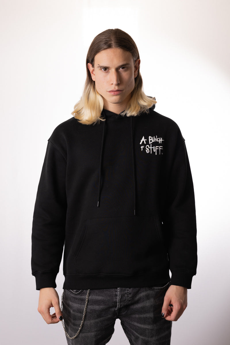 この黒のフーディーには、ジョニー・デップのオリジナルスケッチを基にした「A Bunch Of Stuff」展のロゴが背面に大きくプリントされています。ジョニー・デップの初個展を祝う、シンプルでスタイリッシュな一枚です。
