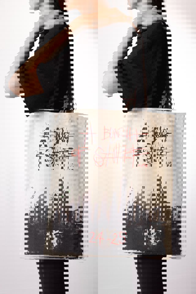 「A Bunch of Stuff Skyline」トートバッグは、本展が最初に開催される都市を記念したデザインで、耐久性に優れた天然素材、黒いストラップ、デザインのプリントが特徴です。毎日の必需品を運ぶのに最適な、アートと実用性をパーフェクトに融合したバッグです。