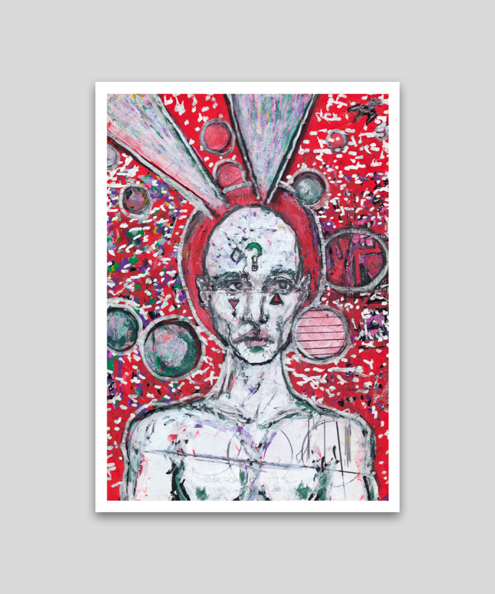 ジョニー・デップの“Everyman”シリーズの一作。大胆な色彩と彼のトレードマークであるクエスチョンマークが特徴的で、リキテックス・アクリルマーカーで描かれた鮮やかで深みのある作品です。